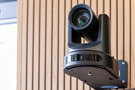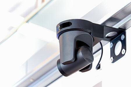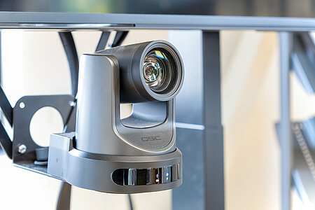 - QSC PTZ-Kamera – direkt am Display montiert, für alle Meeting- und Präsentationsformate