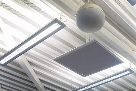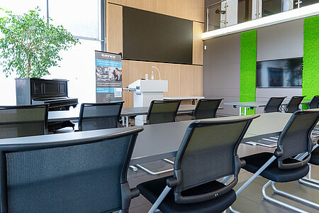Eine weitere Herausforderung lag darin, dass die Fläche flexibel bleiben musste: Vom Auditorium über den Meetingmodus bis hin zu Town-Hall-Formaten sollten alle Varianten ohne großen Aufwand umgesetzt werden können. Zudem war es wichtig, bestehende Komponenten, wie die vorhandenen Deckenpendellautsprecher, sinnvoll einzubinden. Auch die einheitliche Bedienlogik spielte eine zentrale Rolle: Alle Beteiligten sollten die Technik ohne Einarbeitung intuitiv nutzen können – sowohl in der großen Ausstellung als auch im ergänzenden Besprechungsraum im Obergeschoss.