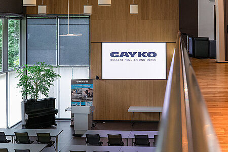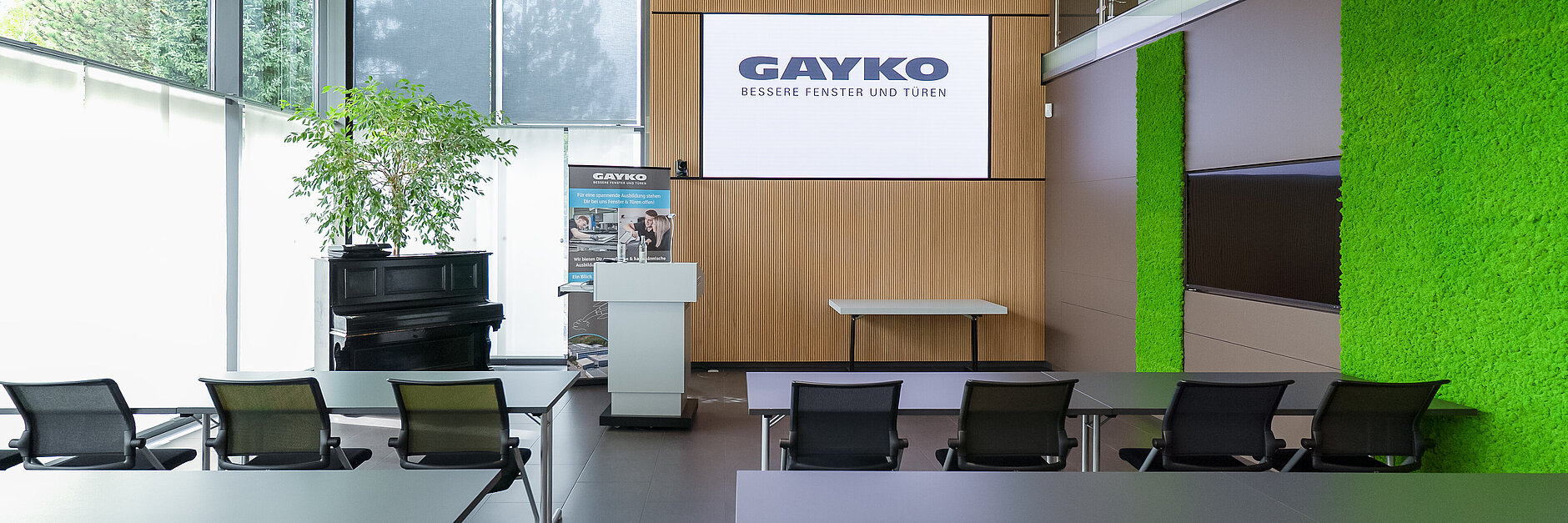 Die GAYKO Fenster-Türenwerk GmbH steht seit vielen Jahren für hochwertige, innovative Produkte und ein modernes Erscheinungsbild. Mit ihrer langjährigen Expertise und starken Marktposition prägt sie sowohl den lokalen als auch den internationalen Wirtschaftsstandort und zählt zu den bedeutenden Impulsgebern der Branche. Auch für ein so gestandenes Unternehmen wachsen die Anforderungen an Präsentations- und Veranstaltungsflächen stetig: Sie sollen inspirieren, informieren und technisch jederzeit verlässlich funktionieren. Die firmeneigene Ausstellung in Wilnsdorf wird bei GAYKO nicht nur zur Präsentation der Produkte genutzt, sondern dient ebenso als Raum für Kundenevents, interne Schulungen, Vertriebsveranstaltungen und Meetings. Sie ist ein zentraler Ort, an dem die Marke erlebbar wird und Kunden sowie Partner ein professionelles, innovatives Umfeld kennenlernen. Auch der angrenzende Besprechungsraum im Obergeschoss soll für Meetings und Videokonferenzen optimal genutzt werden können und stellt sicher, dass interne wie externe Kommunikation reibungslos abläuft. Genau aus diesem Grund war es für GAYKO entscheidend, die Medientechnik sowohl in der Ausstellungsfläche als auch im Besprechungsraum auf ein zeitgemäßes Niveau zu heben und eine Lösung zu schaffen, die all diese unterschiedlichen Nutzungssituationen gleichermaßen unterstützt.