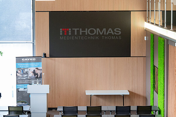 In enger Abstimmung mit GAYKO entwickelten wir ein durchgängiges technisches Konzept, das sowohl die Anforderungen an Flexibilität als auch an Bedienkomfort und Präsentationsqualität erfüllt. Im Zentrum steht eine großformatige LED-Wand, die als visueller Mittelpunkt der gesamten Fläche fungiert und eine beeindruckende Darstellung in jeder Nutzungssituation ermöglicht. Ergänzt wird sie durch hochwertige Audio- und Videotechnik, die speziell auf unterschiedliche Raum- und Veranstaltungsszenarien abgestimmt wurde. Ziel war es, sowohl klassische Präsentationen als auch Schulungen, hybride Meetings und Kundenevents in einer durchgängig hochwertigen Qualität abzubilden. Dabei wurde besonders darauf geachtet, dass die Technik intuitiv bedienbar ist und sich nahtlos in die vorhandenen Raumfunktionen wie Licht, Verdunkelung und Beschallung integriert. Ergänzend wurde gemeinsam mit der Jahn Holzmanufaktur ein maßgeschneidertes Rednerpult entwickelt, das speziell auf die Bedürfnisse des Kunden abgestimmt ist. Hier wurde ein Shure MXA710 LineArray Mikrofon integriert, um beste Sprachqualität bei optimaler Nutzung des verfügbaren Raums zu gewährleisten. Gleichzeitig sorgen die verbauten Lösungen dafür, dass auch der angrenzende Besprechungsraum im Obergeschoss optimal für Meetings und Videokonferenzen ausgestattet ist, sodass beide Bereiche flexibel und effizient genutzt werden können.