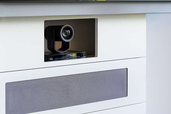 - einen Meetingraum mit perfektem Bild und Ton für digitale und hybride Treffen,