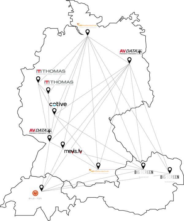 Die im Netzwerk verbundenen Unternehmen installieren und vermieten nicht nur topmoderne Produkte führender Hersteller der Medientechnik, sondern entwerfen auch hochkomplexe, kundenspezifische Fachplanungen. Jedes Unternehmen agiert dabei eigenständig, profitiert jedoch von der gemeinschaftlichen Wissensvermittlung und dem geteilten Erfahrungsschatz. So können wir unseren Kunden maßgeschneiderte, hochmoderne Lösungen bieten und gleichzeitig unsere führende Position in der Branche weiter stärken.